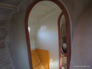 Chaque cadre est composé de 18 pièces droites ou courbes, avec profilage pour créer une feuillure pour les futures portes. l'ensemble des pièces courbes pré -assemblées puis collés en place avec le reste. la finition avec la cloison par un joint congé, le tout ponçé et prêt à être peint.